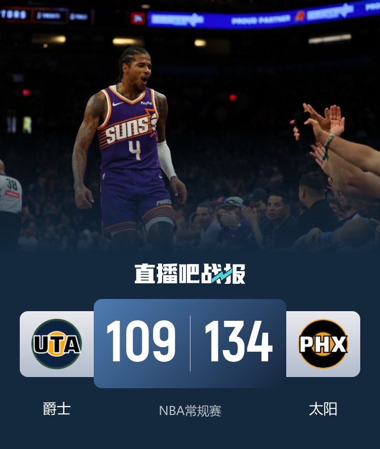此役一上来双方一度缠斗,森萨博和菲利波夫斯基联手取分,但无奈队友状态低迷,太阳多点开花拉开比分,首节结束时太阳确立18分优势,次节回来,爵士进攻依然没有起色,布克联手杰伦·格林率队扩大优势,半场战罢,太阳已经领先28分。易边再战后双方拉开对攻,太阳总能回应牢牢占优,三节结束后太阳依然领先25分,末节上来,爵士追分滞涩逆转无望,比赛提前失去悬念,最终太阳134-109大胜爵士送对手5连败。